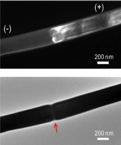 “Eventually, the dislocations start to move down the nanowire in the direction of the current,” Agarwal said. “At certain point, the number and density of dislocations becomes so huge that they jam in one spot.”