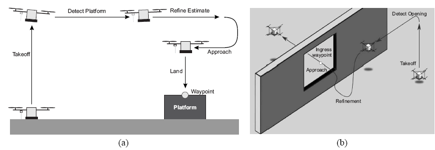After takeoff, the autonomous landing (a) and automated ingress (b) algorithm proceed in three phases: Detection, Refinement, and Approach.