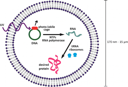 Nanoletters – The development of responsive nanomaterials, nanoscale systems that actively respond to stimuli, is one general goal of nanotechnology. Here we develop nanoparticles that can be controllably triggered to synthesize proteins. The nanoparticles consist of lipid vesicles filled with the cellular machinery responsible for transcription and translation, including amino acids, ribosomes, and DNA caged with a photolabile protecting group. These particles served as nanofactories capable of producing proteins including green fluorescent protein (GFP) and enzymatically active luciferase. In vitro and in vivo, protein synthesis was spatially and temporally controllable, and could be initiated by irradiating micrometer-scale regions on the time scale of milliseconds. The ability to control protein synthesis inside nanomaterials may enable new strategies to facilitate the study of orthogonal proteins in a confined environment and for remotely activated drug delivery.
