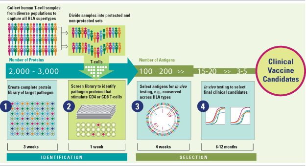 As a result, ATLAS™ winnows what can be as many as several thousand proteins in a pathogen proteome down to a set of a small number of protein antigens that correlate with natural immunity. A subset of proteins from that group is selected for in vivo testing, based on recognition across multiple HLA supertypes and other criteria, with the goal of identifying two to five antigens for formulation and development into a vaccine candidate that will be protective across diverse ethnic populations.