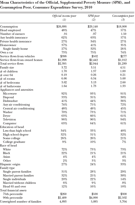 We discuss poverty measurement, focusing on two alternatives to the current official measure: consumption poverty, and the Census Bureau’s new Supplemental Poverty Measure (SPM) that was released for the first time last year. The SPM has advantages over the official poverty measure, including a more defensible adjustment for family size and composition, an expanded definition of the family unit that includes cohabitors, and a definition of income that is conceptually closer to resources available for consumption. The SPM’s definition of income, though conceptually broader than pre-tax money income, is difficult to implement given available data and their accuracy. Furthermore, income data do not capture consumption out of savings and tangible assets such as houses and cars. A consumption-based measure has similar advantages but fewer disadvantages. We compare those added to and dropped from the poverty rolls by the alternative measures relative to the current official measure. We find that the SPM adds to poverty individuals who are more likely to be college graduates, own a home and a car, live in a larger housing unit, have air conditioning, health insurance, and substantial assets, and have other more favorable characteristics than those who are dropped from poverty. Meanwhile, we find that a consumption measure compared to the official measure or the SPM adds to the poverty rolls individuals who are more disadvantaged than those who are dropped. We decompose the differences between the SPM and official poverty and find that the most problematic aspect of the SPM is the subtraction of medical out-of-pocket expenses from SPM income. Also, because the SPM poverty thresholds change in an odd way over time, it will be hard to determine if changes in poverty are due to changes in income or changes in thresholds. Our results present strong evidence that a consumption-based poverty measure is preferable to both the official income-based poverty measure and to the Supplemental Poverty Measure for determining who are the most disadvantaged.