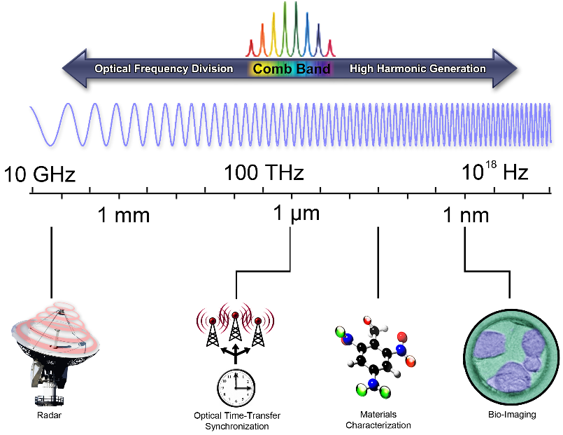 These kinds of pulsed lasers are known as frequency combs because they are composed of thousands of individual laser lines, equally separated in frequency like the teeth of a comb. DARPA seeks to control the entire electromagnetic spectrum by using frequency combs to generate and engineer waves in the optical domain and then down or up-convert those waveforms to the desired wavelength. Such technology has many potential applications relevant to the Department of Defense (DoD), such as low phase noise microwave oscillators for secure communications, explosive and chemical agent detection, and the production of attosecond (10-18s) pulses for imaging the motion of electrons in complex materials.