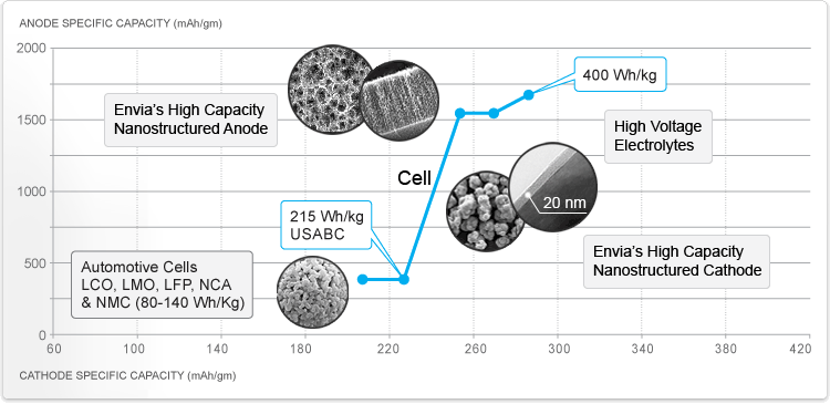 Envia is a high energy density leader in the lithium-ion battery space, having developed intellectual property and cell prototypes using Envia cathode, anode and electrolyte. Envia is engaged with automotive OEMs around the world – developing custom cathode material, electrolyte and cell designs for these OEMs automotive applications. As a proof of technical leadership, Envia has also demonstrated the world’s first 400Wh/kg in large format pouch cells.