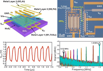 ABSTRACT – Two-dimensional (2D) materials, such as molybdenum disulfide (MoS2), have been shown to exhibit excellent electrical and optical properties. The semiconducting nature of MoS2 allows it to overcome the shortcomings of zero-bandgap graphene, while still sharing many of graphene’s advantages for electronic and optoelectronic applications. Discrete electronic and optoelectronic components, such as field-effect transistors, sensors, and photodetectors made from few-layer MoS2 show promising performance as potential substitute of Si in conventional electronics and of organic and amorphous Si semiconductors in ubiquitous systems and display applications. An important next step is the fabrication of fully integrated multistage circuits and logic building blocks on MoS2 to demonstrate its capability for complex digital logic and high-frequency ac applications. This paper demonstrates an inverter, a NAND gate, a static random access memory, and a five-stage ring oscillator based on a direct-coupled transistor logic technology. The circuits comprise between 2 to 12 transistors seamlessly integrated side-by-side on a single sheet of bilayer MoS2. Both enhancement-mode and depletion-mode transistors were fabricated thanks to the use of gate metals with different work functions.