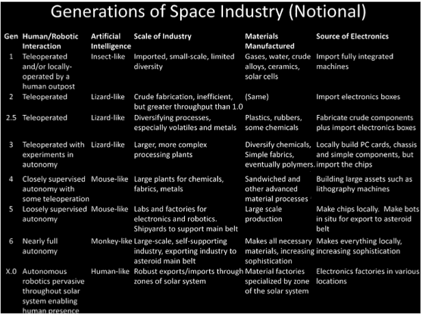 ABSTRACT- Advances in robotics and additive manufacturing have become game‐changing for the prospects of space industry. It has become feasible to bootstrap a self‐sustaining, self‐expanding industry at reasonably low cost. Simple modeling was developed to identify the main parameters of successful bootstrapping. This indicates that bootstrapping can be achieved with as little as 12 metric tons (MT) landed on the Moon during a period of about 20 years. The equipment will be teleoperated and then transitioned to full autonomy so the industry can spread to the asteroid belt and beyond. The strategy begins with a sub‐replicating system and evolves it toward full self‐sustainability (full closure) via an in situ technology spiral. The industry grows exponentially due to the free real estate, energy, and material resources of space. The mass of industrial assets at the end of bootstrapping will be 156 MT with 60 humanoid robots, or as high as 40,000 MT with as many as 100,000 humanoid robots if faster manufacturing is supported by launching a total of 41 MT to the Moon. Within another few decades with no further investment, it can have millions of times the industrial capacity of the United States. Modeling over wide parameter ranges indicates this is reasonable, but further analysis is needed. This industry promises to revolutionize the human condition.