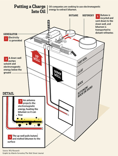 1. Wall Street Journal – oil companies here are experimenting with technologies that could unlock even more reserves from what is some of the world’s heaviest and stickiest petroleum. The new technologies could also drive down the cost of producing oil in Canada.