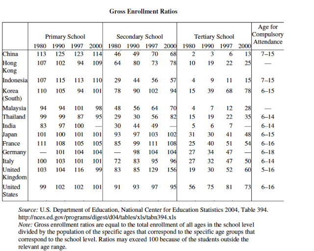 to 25 in the next twenty years, which would put the tertiary level of education in China at about where the Western European nations were in 1980. That level of labor augmentation would add 4.4 percent to the growth rate of labor productivity, and by itself would account for over 60 percent of the target set in 2002. With a more ambitious expansion of higher education, reaching enrollment ratios of 50 in 20 years, labor augmentation would grow at 11.2 percent. The rate of investment in human capital would by itself add 6.7 percent to the overall growth rate.These targets for higher education are not out of reach. It should be remembered that as recently as 1980, the Western European nations had ratios of about 25. Only the United States was above 50. The movement to enrollment ratios of 50 in Western Europe was a product of the last two decades of the twentieth century. In the case of the U.K., two-thirds of the increase from 19 to 52 percent took place between 1990 and 1997.
