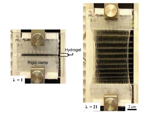 The researchers pinned both ends of the new gel in clamps and stretched it to 21 times its initial length before it broke. (Photo courtesy of Jeong-Yun Sun.)