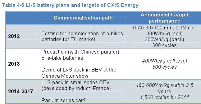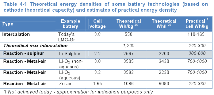 Based on recent progress of Li-sulphur cells and if their life cycle properties were to be improved, a base scenario would see their entry in the car market in 2025 with an energy density of 350Wh/kg, increasing to 500Wk/kg by 2030. A more aggressive scenario would see 300Wh/kg Li-S cells by 2020, increasing to 500Wh/kg by 2030.