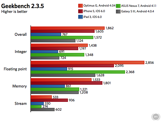 The Nexus 4 will wipe the floor with the Galaxy SIII and Nexus 7 in both CPU and GPU performance, and while it doesn’t always beat the Apple A6 in the iPhone 5, it’s always very close in synthetic benchmarks. Between the two, the iPhone’s dual-core A6 may have the advantage in real-world performance, since not all apps will be able to take advantage of all four of the Snapdragon’s CPU cores, but we need more real-world comparison time to say for certain. If you can get past the lack of LTE, the Nexus 4 (and by extension the Optimus G, which will give you LTE but take away the Nexus line’s guaranteed updates) is easily the fastest Android handset you can buy today.