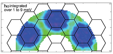 This image depicts magnetic effects within Herbertsmithite crystals, where green regions represent higher scattering of neutrons from NIST’s Multi-Angle Crystal Spectrometer (MACS). Scans of typical highly-ordered magnetic materials show only isolated spots of green, while disordered materials show uniform color over the entire sample. The in-between nature of this data shows some order within the disorder, implying the unusual magnetic effects within a spin liquid.