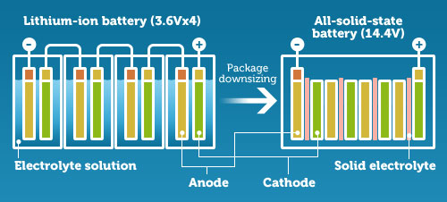 Toyota has long clung to the Nickel-Metal-Hydride (NiMH) batteries, claiming that lithium-ion batteries are too expensive. Toyota is looking to solid state and lithium-air batteries. By modifying liquefied electrolytes into solid electrolytes, it allows each cells to connect without the need for individual casing, which results in creating a more compact packaging. Solid state batteries could thus have one fifth the volume of current batteries. What makes that possible is the use of solid electrolytes. Rather than a liquid sloshing around, a solid state battery has blocks of solid material pressed together. This requires less packaging to achieve the same effect as the liquid electrolyte batteries.