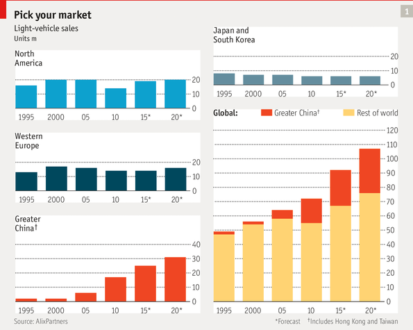 AlixPartners, a consultancy, forecasts that the worldwide market for cars and other light vehicles will expand from about 80m units a year now to 107m in 2020. In China, now the world’s biggest market for cars, annual sales are expected to rise from 19m last year to 31m in 2020 as car ownership spreads to the country’s vast interior. So over the next seven years a Europe-sized market will grow up in China’s hinterland.