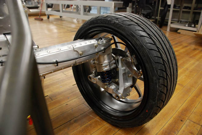 The patented in-wheel suspension allows an uncluttered design with only 4 structural connection points (instead of the 12 or more in conventional designs), reducing weight and improving packaging. Wheels external to the frame allow superior aerodynamics and create new crush zones for passenger compartment integrity.