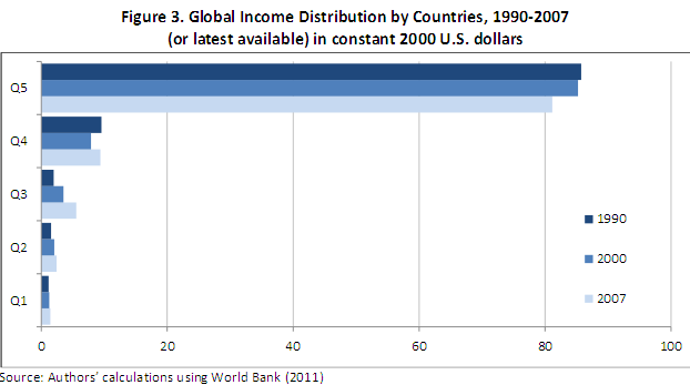 This statistical distortion is clear from international data. Average world GDP per capita, that is world GDP divided by the number of people, is slightly more than $10,000 per year. But only 29.9 percent of the world’s population lives in countries with GDP per capita above that level while 70.1 percent live in countries below it. Something with only 29.9 percent above and 70.1 percent below is not most people’s idea of an average.