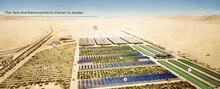 An oasis of green technologies: 1. Concentrated Solar Power; 2. Saltwater greenhouses; 3. Outside vegetation and evaporative hedges; 4. Photovoltaic Solar Power; 5. Salt production; 6. Halophytes; 7. Algae production