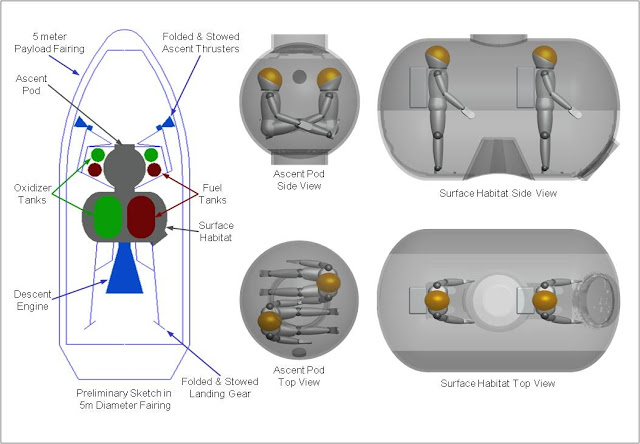 A novel set of options using a minimalist pressurized ascent pod and descent stage with a surface habitat was also studied and shown to be viable. Layout sketches of this concept show that it can be packaged within a five-meter diameter fairing payload envelope.