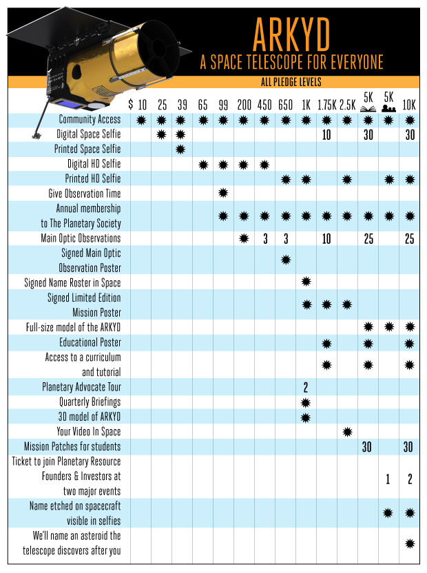 * To build excitement about space and all of its potential — The ARKYD is designed to be a fun and interactive experience that is accessible to anyone. This kind of direct access to a satellite is unprecedented. Our backers will be the first people in history to control a public space telescope!