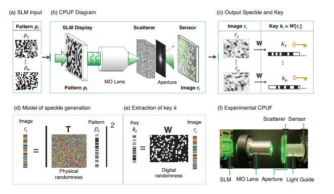The construction and operation of a CPUF (communication physical unclonable function). (a) Sequentially over time, n random phase patterns pi are displayed on an SLM. (b) A microscope objective (MO) focuses each random wavefront from the SLM onto a volumetric scatterer. The scrambled light emerging from the material passes through a designed aperture before being detected by a CMOS sensor. (c) Each detected speckle image r is digitally transformed into an ideally random key k with a constant digital whitening projection operator W. (d) Optical scattering is mathematically represented by a complex random Gaussian matrix T and (e) digital whitening is described by a sparse binary random matrix W. The combination of one unique T and general W per CPUF device leads to an ideally random multi-gigabit key space that is very difficult to characterize or clone. (f) The experimental CPUF setup, including all components in (b).