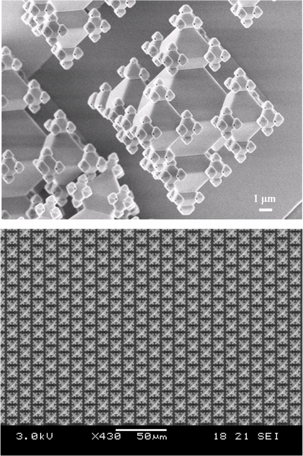 In summary, a new class of 3D structures fabricated by a repeated silicon nanomachining procedure is demonstrated: octahedral fractals. It makes use of the crystalline property of silicon to form octahedral pits and corner lithography to define the location of the next level of octahedra in the silicon mold. Another essential feature of this technique is its ability to accurately form multiscale structures based on a single conventional lithographic step. We demonstrated the fabrication of dense, perforated and wire-like fractal structures. Starting from a single micron-sized mask opening, we have shown the creation of 625 nanopores for each individual octahedral fractal resulting in an apparent porosity of 4% and a fractal with a freely accessible area increased by a factor of 6.5 with respect to the occupied wafer area.