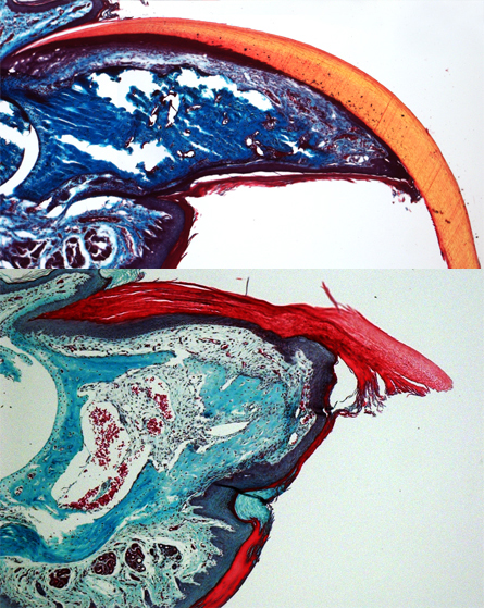A mouse toe tip five weeks after amputation looks like new (top). But when signals from the nail tissue are blocked, the nail and digit can’t regrow (bottom). Muscles and nail keratin are stained red in the image and collagen is green or blue. Takeo et al/Nature 2013