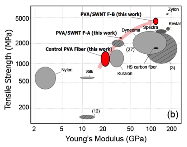 Marilyn Minus, an assistant professor of engineering at Northeastern, has developed a type of carbon nanotube based polymer fiber that is stronger than the first kevlar, spectra and—even in its first generation—closely approaches the strength of the fourth (Zylon). It’s the crystallization process that drives the remarkable properties recently reported. In their research, Minus and her colleagues showed that they could easily turn these properties on or off. By changing nothing but the pattern of heating and cooling the material, they were able to increase the strength and toughness of fibers made with the very same ingredients. In the current research, Minus and her colleagues worked out the recipe and process for one particular polymer: polyvinyl alcohol. “But we can do this with other polymers and we are doing it,” she said.
