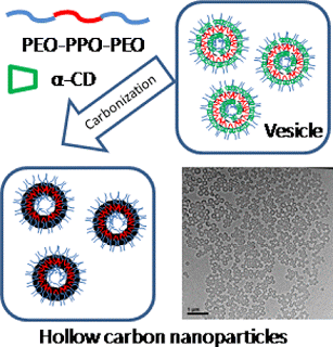 The water-repelling poly(propylene oxide) parts of the polymer stuck together to form hollow spheres, leaving poly(ethylene oxide) molecules dangling from the outside. The α-cyclodextrin rings then threaded onto these strands, packing around the outside of the sphere to form a stable shell. Using a higher proportion of F127 in the mix produced larger nanospheres, ranging from 200 to 400 nanometers in diameter. Heating these particles to 900 °C in inert gases burned off the polymer to make hollow carbon nanoparticles.