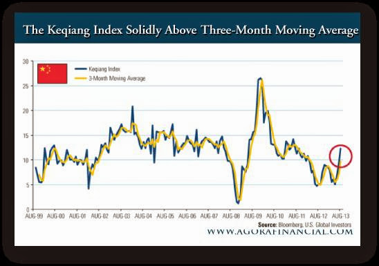 Taking the weighted average of the year-over-year growth of 40% power generation, 35% total loans outstanding, and 25% rail freight volume, the ‘Keqiang Index’ showed an increase of 12.3%. This is the fastest since September 2011 and solidly above the three-month average.