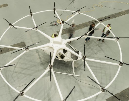 A two person electric volocopter has flown. The Volocopter has six arms extending from the central part of the rotor ring split into twelve more arms, with rotors placed at each juncture. The Volocopter is an environmentally friendly and emission-free private helicopter. Instead of one combustion engine, eighteen electrically driven rotors propel it.