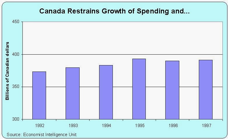 Canada has a government deficit this year of about $6 billion vs $600 billion for the US and had deficits of $25-40 billion during the crisis while the US had over $1 trillion deficits each year. Even if multiplying by nine times for population adjustment Canada is still way lower in terms of spending and deficits.