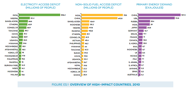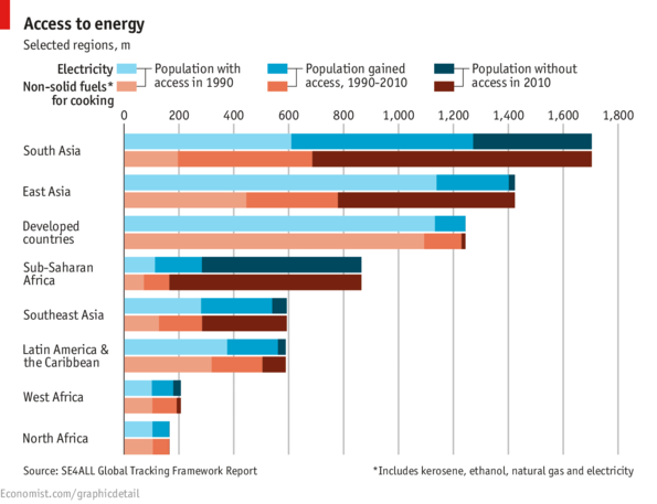 In 2010, some 2.8 billion people relied on traditional fuels such as wood, charcoal and animal and crop waste to cook and heat their homes; three-quarters of them lived in just 20 countries in Asia and Africa; 1.2 billion, or 17% of the world’s population still have no electricity. Achieving universal access to modern energy (electricity and clean and modern cooking) is one of three objectives of the UN’s Sustainable Energy for All (SE4All) initiative, alongside greater energy efficiency and increased use of renewables. The initiative is led by the World Bank and the International Energy Agency (IEA). Its first report, released on May 28th, compiled global data from 15 agencies. The IEA reckons that nearly $50 billion a year will be needed to achieve the first goal (universal electricity and clean cooking) by 2030.