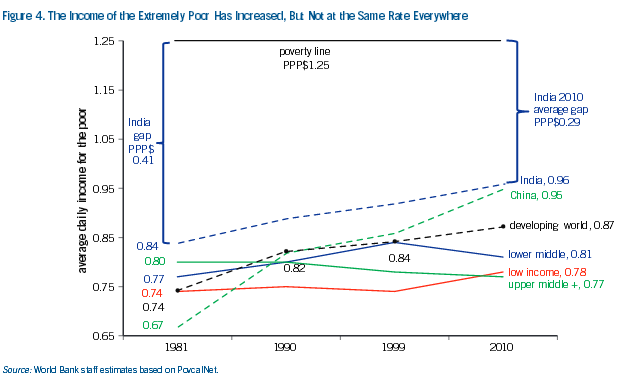 Another way of interpreting the APG/GDP ratio is the following: Suppose that the real GDP growth for the developing world as a whole is 5 percent per year. If 10 percent of this GDP growth accrued to the 21 percent of the developing world’s population who are extremely poor, and this 10 percent was distributed in a way that the growth in income of each poor person was exactly his/her distance to the $1.25 line, extreme poverty would end in one year.