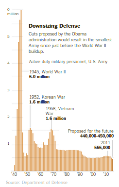 A reduction to 450,000 would be the Army’s smallest size since 1940, before the United States entered World War Two, when it counted a troop strength of 267,767, according to Army figures. The Army’s previous post-World War Two low was 479,426 in 1999.