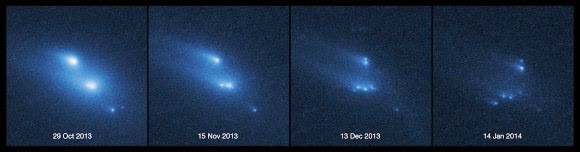 “This is a really bizarre thing to observe — we’ve never seen anything like it before,” said co-author Jessica Agarwal of the Max Planck Institute for Solar System Research, Germany. “The break-up could have many different causes, but the Hubble observations are detailed enough that we can actually pinpoint the process responsible.”
