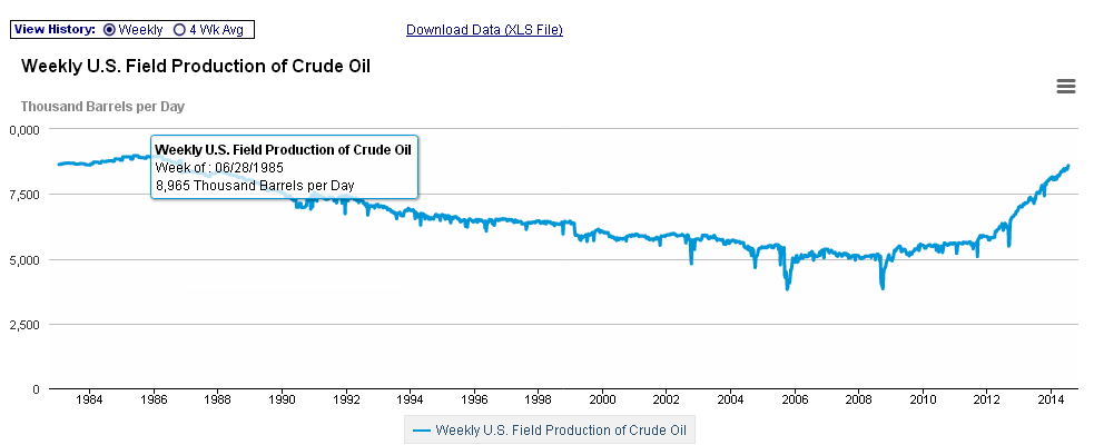 If there is a similar oil production surge from the Texas oil fields then the US could break 9 million barrels per day by September, 2014. This would be more than any year since the mid-1970s. In 1970, there was a peak of 9.637 million barrels per day.