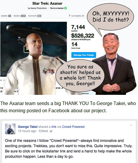 George Takei (Sulu from the old Star Trek) series posted on Facebook TWICE and Tweeted about us as well. Because of this, our Kickstarter has shot through the roof. Axanar is the # 1 most popular Kickstarter right now and has added over $160,000 so far today.