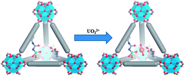Three metal–organic frameworks (MOFs) of the UiO-68 network topology were prepared using the amino-TPDC or TPDC bridging ligands containing orthogonal phosphorylurea groups (TPDC is p,p′-terphenyldicarboxylic acid), and investigated for sorption of uranium from water and artificial seawater. The stable and porous phosphorylurea-derived MOFs were shown to be highly efficient in sorbing uranyl ions, with saturation sorption capacities as high as 217 mg U g−1 which is equivalent to binding one uranyl ion for every two sorbent groups. Coordination modes between uranyl groups and simplified phosphorylurea motifs were investigated by DFT calculations, revealing a thermodynamically favorable monodentate binding of two phosphorylurea ligands to one uranyl ion. Convergent orientation of phosphorylurea groups at appropriate distances inside the MOF cavities is believed to facilitate their cooperative binding with uranyl ions. This work represents the first application of MOFs as novel sorbents to extract actinide elements from aqueous media.