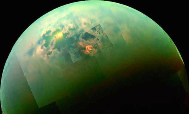 Near-infrared view, taken Aug. 21, 2014 from Cassini of sunlight glints on methane/ethane seas and lakes near Titan’s north pole. Image Credit: NASA/JPL-Caltech/University of Arizona/University of Idaho