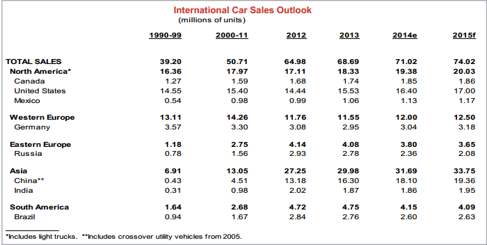 Canada’s Scotiabank has a Global Auto Report They reported 71 million cars were produced in 2014 and expect 74 million cars for 2015.