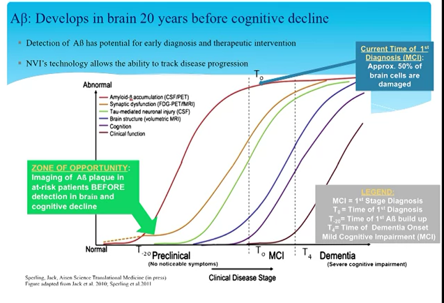Problem: 1/3 Americans born today will live to 100. That’s really great but cognitive decline begins at 30 and it’s just a matter of time before dementia develops. Alzheimer’s specifically accounts for 70% of dementia cases and has no treatment. Alzheimer’s costs the US healthcare system $200 Billion dollars today and if no treatment is developed will bankrupt the healthcare system in a short period of time.