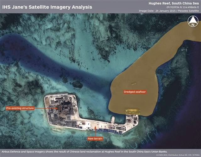 Satellite analysis published by IHS Jane’s Defense Weekly this week showed a new installation being built on Hughes Reef. It described a “large facility” having been constructed on 75,000 square meters of sand reclaimed since August.
