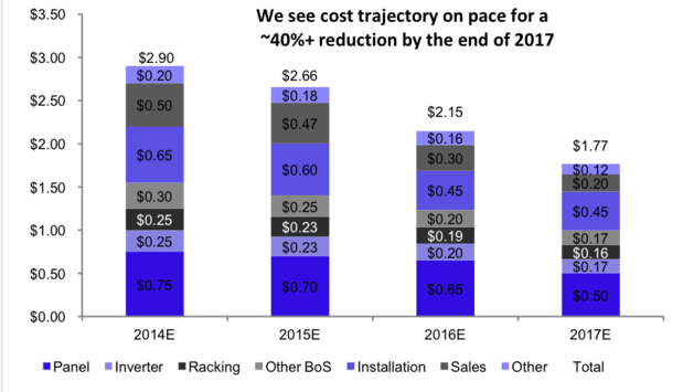 Deutsch Bank expects solar electricity to become competitive with retail electricity in an increasing number of markets globally due to declining solar panel costs as well as improving financing and customer acquisition costs. Unsubsidized rooftop solar electricity costs between $0.08-$0.13/kWh, 30-40% below retail price of electricity in many markets globally. In markets heavily dependent on coal for electricity generation, the ratio of coal based wholesale electricity to solar electricity cost was 7:1 four years ago. This ratio is now less than 2:1 and could likely approach 1:1 over the next 12-18 months.