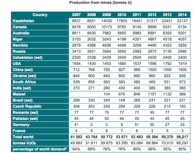 Again we use the World Nuclear Association numbers of uranium production when reported.