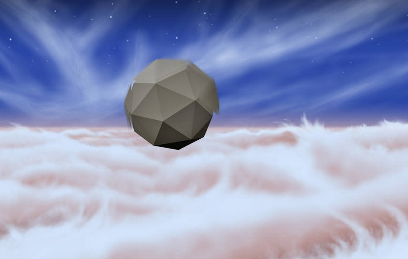 An artist’s rendering shows a windbot bobbing through the skies of Jupiter, drawing energy from turbulent winds there. This notional windbot is portrayed as a polyhedron with sections that spin to absorb wind energy and create lift, although other potential configurations are being investigated.
