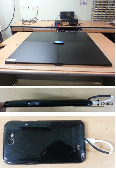Wide-range omnidirectional wireless-charging system based on DCRS can charge multiple numbers of mobile devices simultaneously in a 1m3 range. The above is a transmitter, and the below is a Samsung Galaxy Note with a receiver embedded inside.