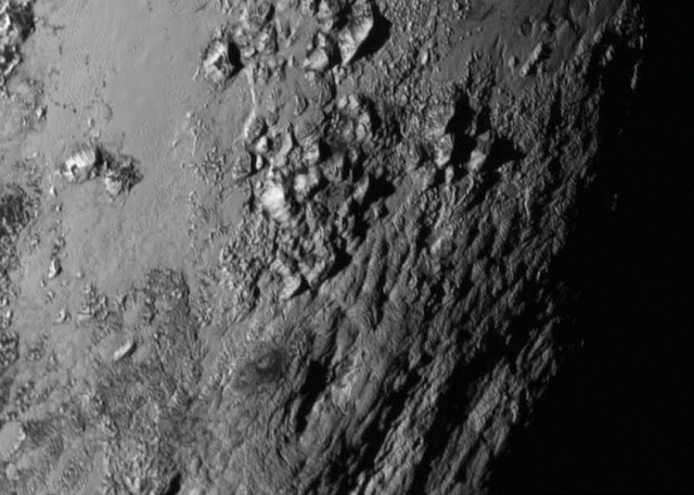New close-up images of a region near Pluto’s equator reveal a giant surprise — a range of youthful mountains rising as high as 11,000 feet (3,500 meters) above the surface of the icy body.