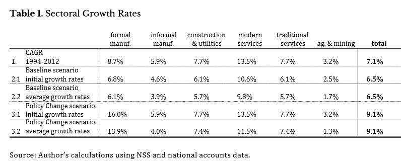 The policy change scenario forecasts that 15% of the work force could be employed in high-productivity industries in the formal manufacturing sectors and modern services. As a comparison point, (Green 2014)estimates that almost half the Indian workforce will have finished high school by 2035, double the share today. This would represent a dramatic improvement over the the current workforce. Compare this to the profile of the industries most likely to need workers with at least a high school education. Currently ,48% of workers in organized manufacturing have at least a high school education, 88% of modern service workers and 60% of traditional service workers.