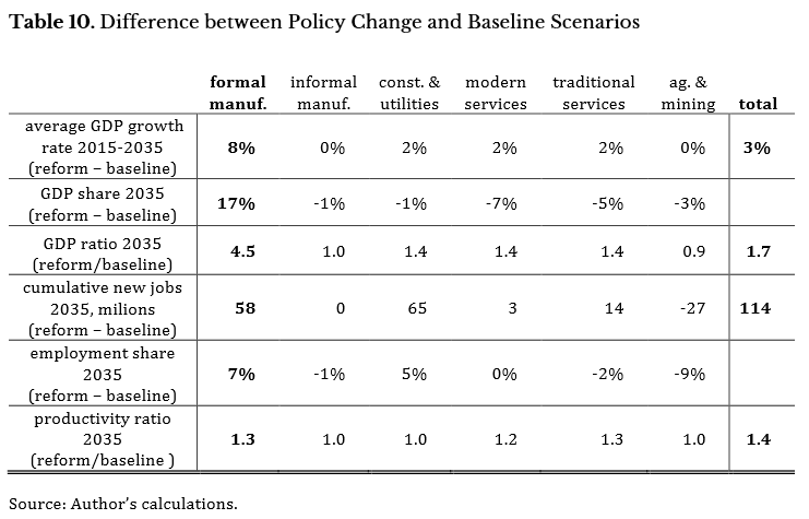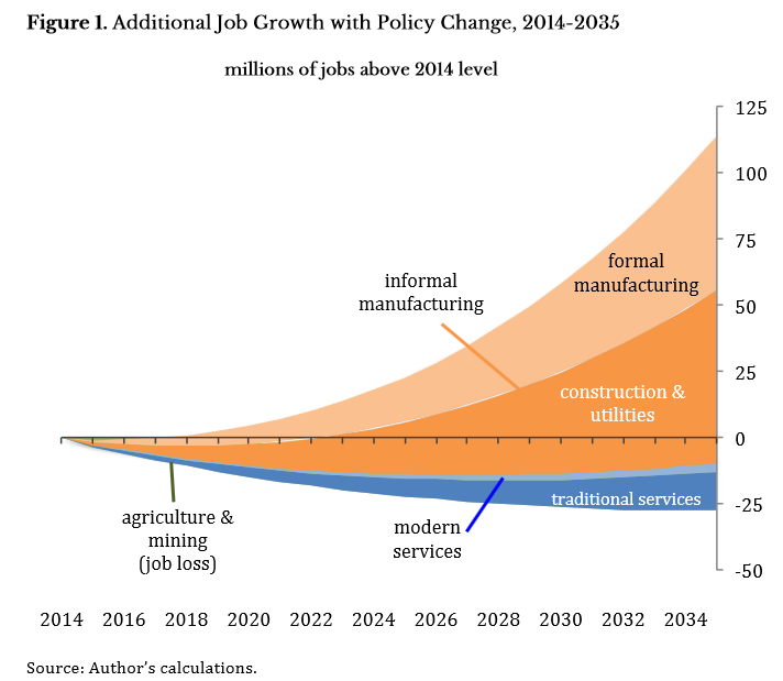 Second,the main conclusions of this study could be established with a relatively casual parameterization, as the basic results could be attained from a range of realistic assumptions. One point of rigorously parameterizing the model is to rigorously rule out what is not realistic. The Make In India goals of manufacturing reaching 25% of GDP and creating 100 million new jobs by 2022, while worthwhile for inspirational purposes, do not appear realistic. The latter does not even appear realistic in a 20-year time frame. Nonetheless, “big bang” reforms could generate a significant dividend for India under plausible assumptions. This study should provide motivation to the political leadership in state and central governments in India to pursue reforms ambitiously to remove barriers to labor-intensive manufacturing