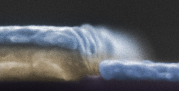 In this scanning electron micrograph of a programmable memristor switch, a pair of gold and silver electrodes is separated by an air gap of only 35 nanometers. Its switching behavior can be reprogrammed by applying a specific voltage across the electrodes that either leads to the formation or rupture of tiny silver filaments between them.