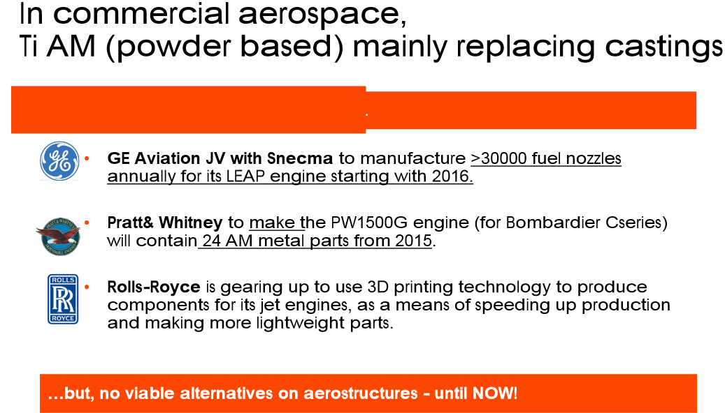 * Production of aerospace parts by conventional technologies requires about 5 times the material amount in the final part, and individual parts may have “buy to fly” values of 10 or more. Additive manufacturing can reduce the “buy to fly” ratio significantly, typically to 1.5 or better.